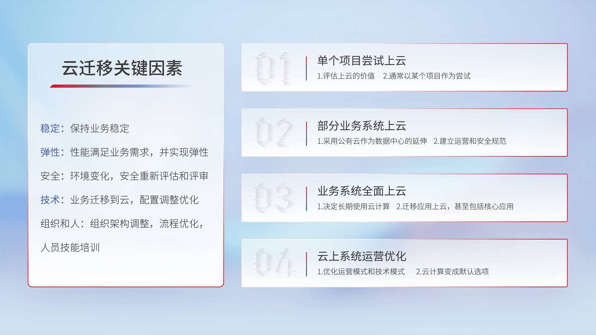 结合实际业务,,从规划设计、、、、云平台选型、、云原生改造、、、、数据迁移、、、、集成交付,,迁移全过程为客户识别最佳上云路径,,,,做好风险识别管理,,,设计网络架构、、、身份权限、、安全审计合规、、操作审计、、、日志审计、、、、监控告警策略、、多站点容灾设计等,,对云上基础设施进行整体规划,,,,提升IT治理水平,,,,以满足弹性、、高可用、、、高性能的需求。。。