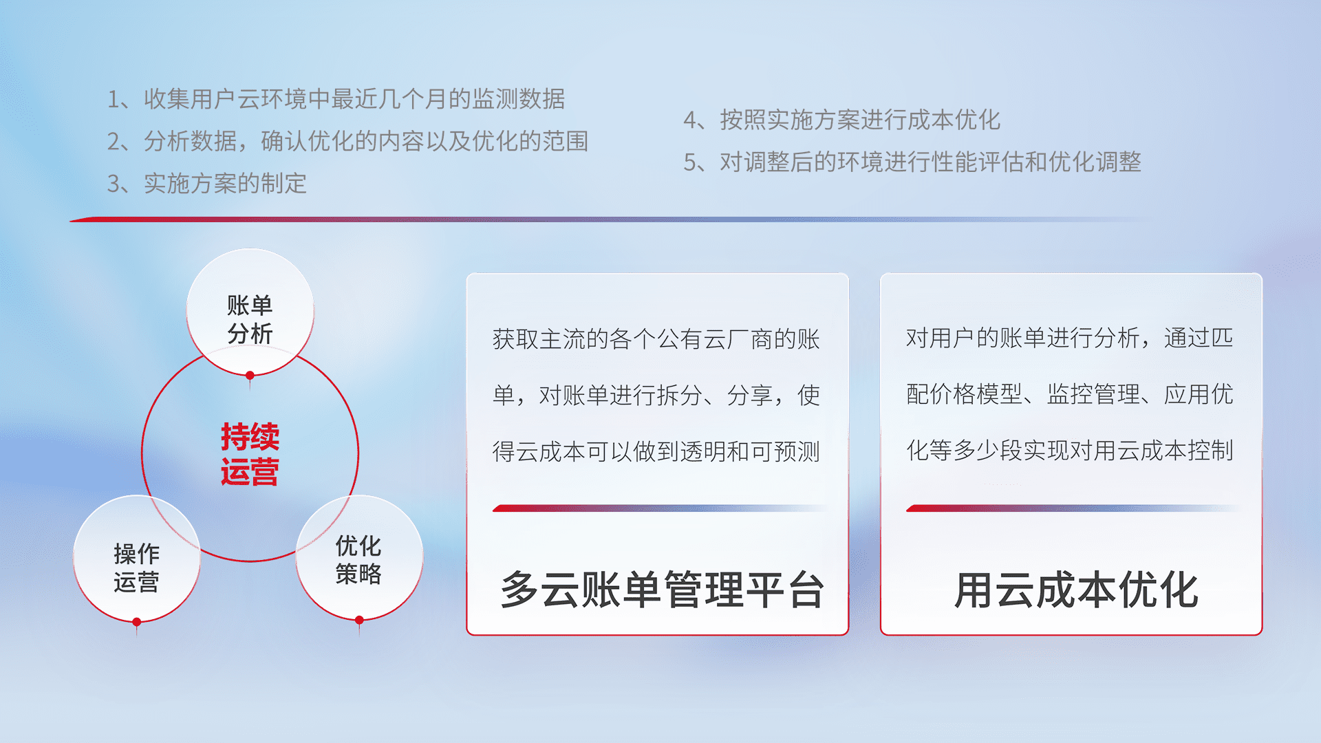 通过多云纳管,,,,以统一的资源数据模型把客户的云资源进行抽象和封装,,,,进而实现对多云资源的统一操作,,,保障云资源管理的可靠性、、稳定性与可用性。。。。量身定制化运维内容,,配置、、开发运维、、、、补丁管理、、备份、、、监控、、认证和访问管理、、、审计和日常巡检等,,保障在用云过程中的可靠度,,稳定度以及高可用率。。
